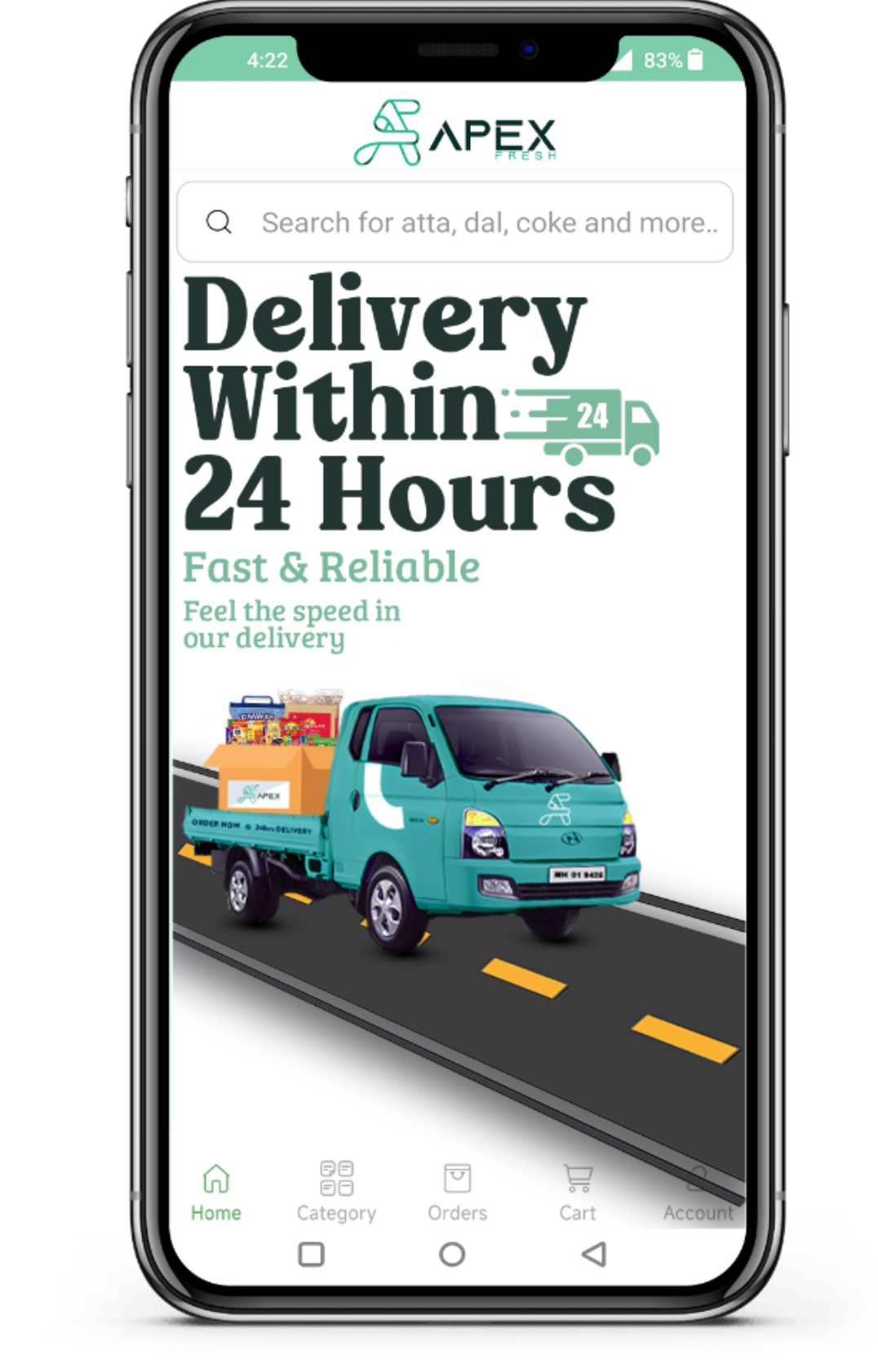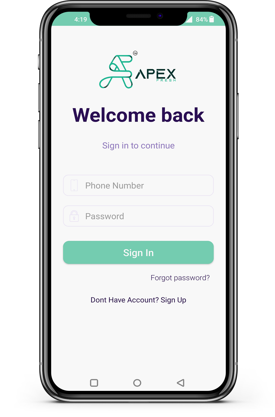 Here are the steps you need to take to download the Apex Fresh App: Install the Apex Fresh app from the Play Store on your phone. When the app is installed, you will be able to see an icon for it on your home screen. Click on the app icon called "Apex Fresh." Sign up by clicking "Register" and entering your name, phone number, and email ID to get the OTP and verify your KYC, such as your shop's name, address, and GST certificate. You'll then get an ID password. That's all; happy shopping!